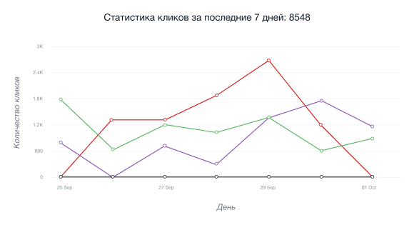 • Графика сіздің серіктестік сілтемеңізге және серіктестік меткаларға барлық рефералдардың жалпы өтудер санын көрсетеді таңдалған уақыт периодына.